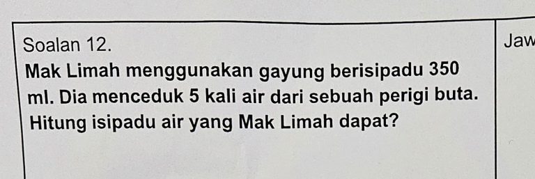 Rupa-rupanya sebab soalan tu cakap Mak Limah ambil air dari perigi buta… Maknanya? Perigi tu kering! 😳 Takde air langsung! 5 kali ceduk pun… jawapannya 0 ml ! 💥😂
